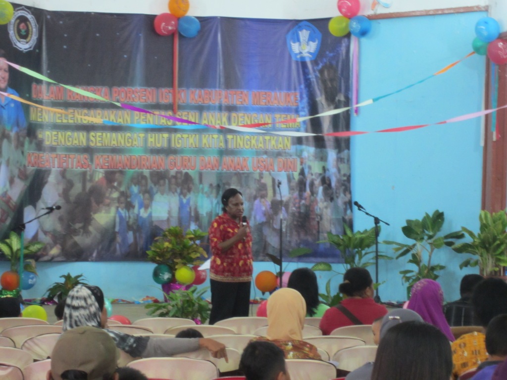Dalam rangka Porseni IGTKI Kabupaten Merauke menyelenggarakan Pentas Seni Anak yang bertempat di Gedung Vertenten Sai, Sabtu, 8 Juni 2013 dan dibuka Oleh Setda Kabupaten Merauke Drs. Daniel Pauta, dalam sambutannya beliau mengatakan mengajak bersama- sama melayani generasi penerus, terutama anak yang merupakan aset bagi kita, pembangunan di masa yang akan datang. Dan berharap kegiatan ini dilakukan terus dilakukan sehingga ada kesempatan bagi kita semua untuk memberikan perhatian yang besar bagi anak-anak generasi bangsa dengan kemudian mereka mendapat bekal bagi di kehidupan yang akan datang.