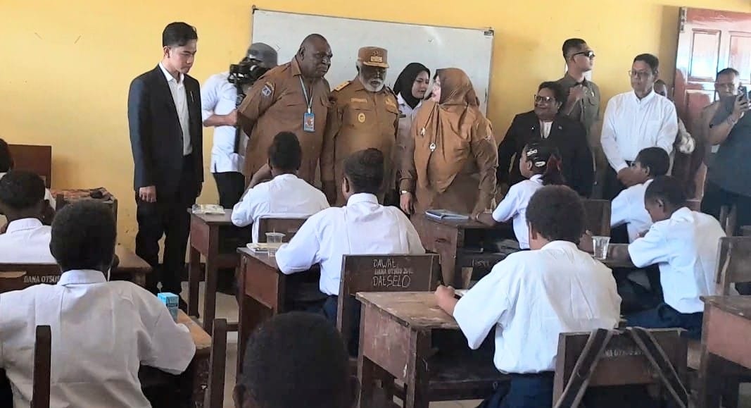Merauke - Wakil Presiden (Wapres) Gibran Rakabuming Raka melakukan kunjungan ke SMPN Gudang Arang Merauke, Selasa, (16/9/2025) tepat pukul 10.47 WIT tiba di sekolah.